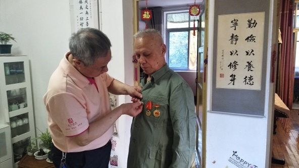 杨正明于1968年3月正式入伍,直至1973年3月退役。他担任过班长,还曾在1968-1970年参加援越抗美战争。王捍东于1968年入伍,隶属于铁道兵某部队。杨正明和王捍东是关系亲密的战友。他们虽已年逾古稀,但身体都很健朗。在这次探访中,他们重新穿上了军装。他们相互整理着装、佩戴徽章,向我们讲述他们的经历。回忆起当年艰苦的生活环境和的恶劣情况,杨正明坚定地说:“我们都有着坚定的理想信念,不怕这些苦。一心只想着胜利,能够早日回到祖国的怀抱。”谈起退伍后的生活,王捍东说自己先是当工人,后来是骨干,又先后两次上了工人大学,进行系统的理论学习。王捍东主修机器制造专业,前后大概学习了7年,后来当了机械工程师。他回忆说:“当时还兴起计算机学习热潮,重新学习计算机对于一个已经30多岁的结婚有家庭的人来说很困难,特别是学习0和1来这些代码。但我们军人向来是不怕苦、不怕难的。”