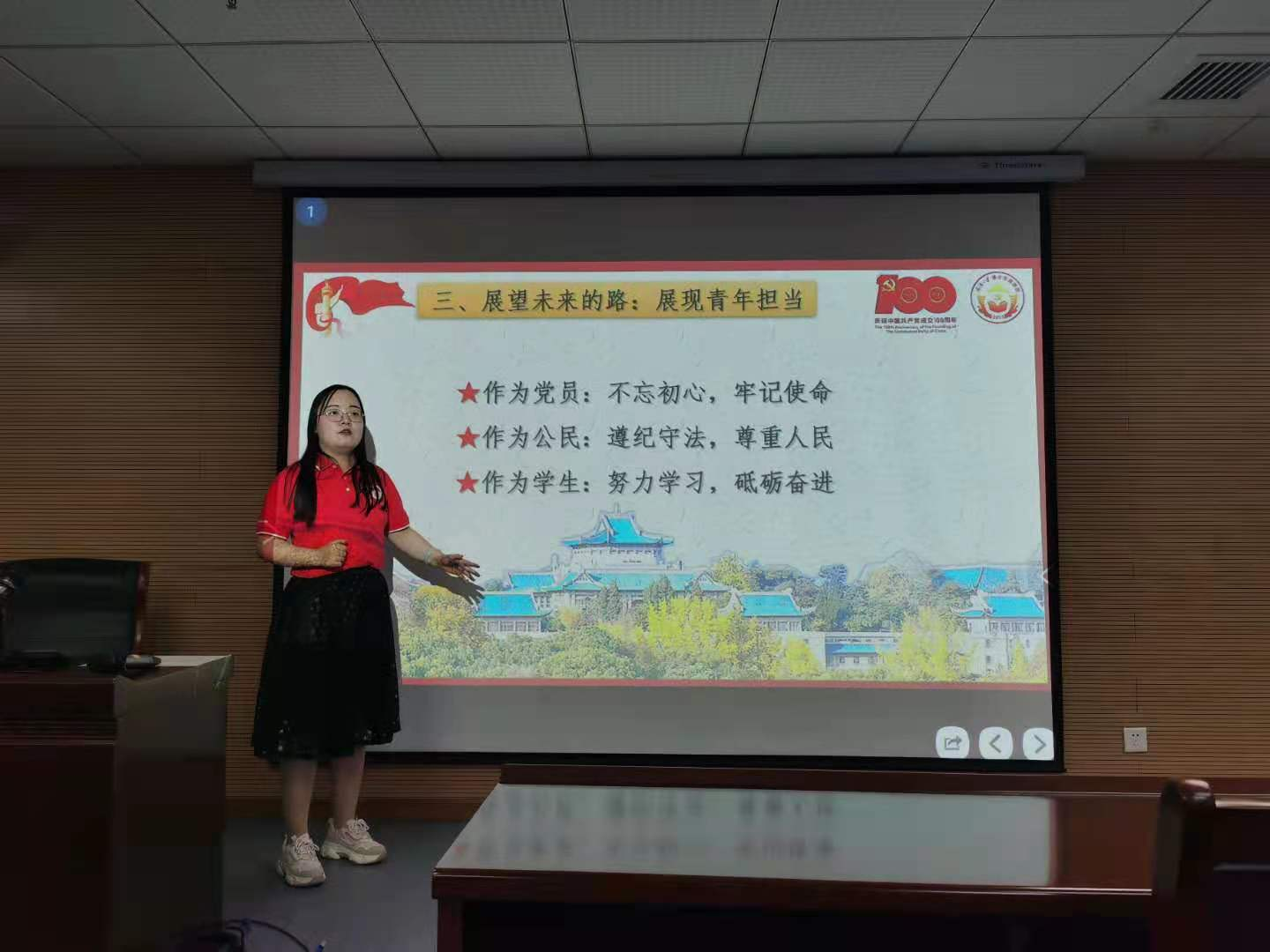展望未来的路:展现青年担当。结合疫情防控中青年学生参与志愿服务和科研抗疫的优秀事迹,黄丹阳同学提出了当代青年党员要展现自己的青年担当。作为党员要不忘初心、牢记使命;作为公民要遵纪守法、尊重人民;作为学生要努力学习、砥砺奋进。