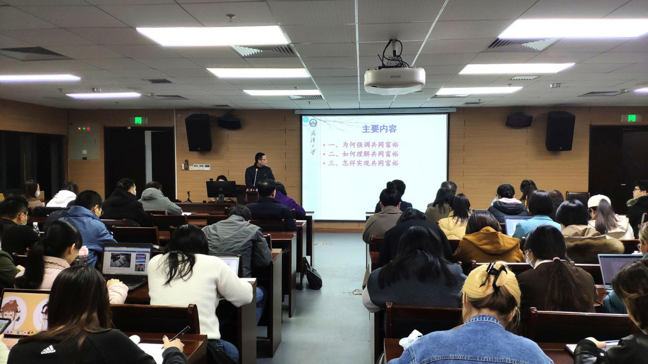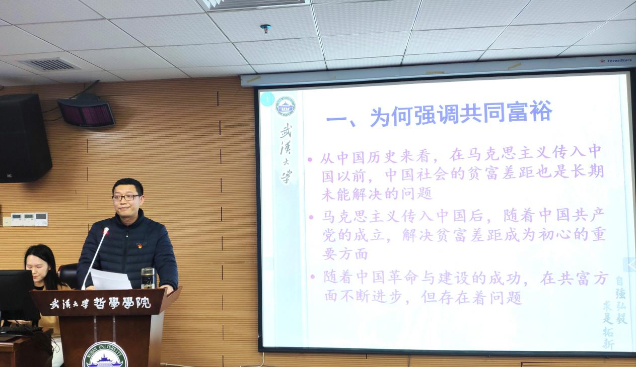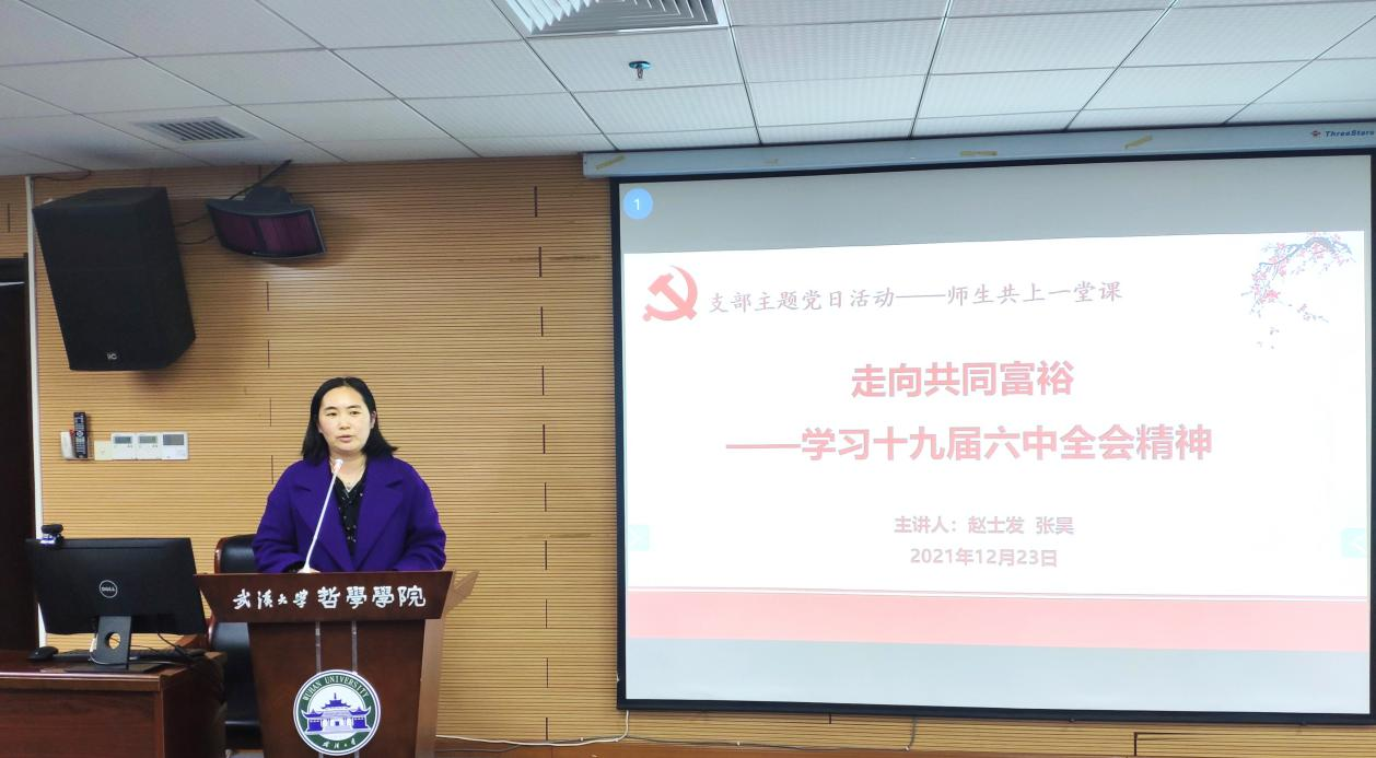 (通讯员翁路)为深入学习贯彻党的十九届六中全会精神,色情导航 于2021年12月23日下午在学院B107开展“师生共上一堂课”支部主题党日活动。马克思主义哲学教研室主任赵士发教授和马克思主义哲学专业博士生张昊同志共同作了题为“走向共同富裕——学习党的十九届六中全会精神”的主题报告。行政党支部、马哲教工党支部、马哲博士生党支部、马哲硕士生党支部以及本科生党支部参加此次主题党日活动。主题党日活动由李志副院长主持。色情导航 校党委第七轮巡视第三巡视组旁听此次主题党日活动的讲座。