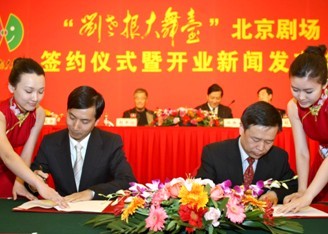 刘双平(前排左二)与北京崇文区代表签订“刘老根大舞台”北京剧场协议