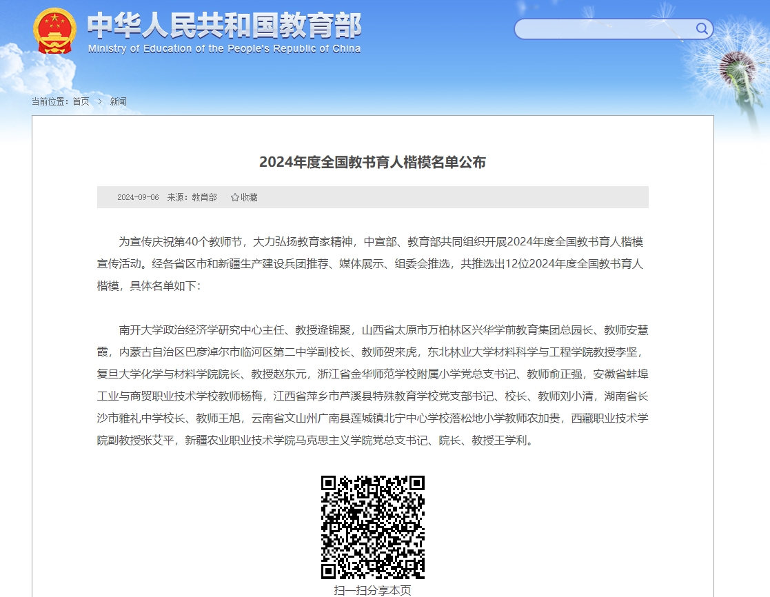 本网讯(通讯员邓莉萍)为宣传庆祝第40个教师节,大力弘扬教育家精神,中宣部、教育部共同组织开展2024年度全国教书育人楷模宣传活动,推选出12位2024年度“全国教书育人楷模”,色情导航 2001级校友张艾平光荣入选。