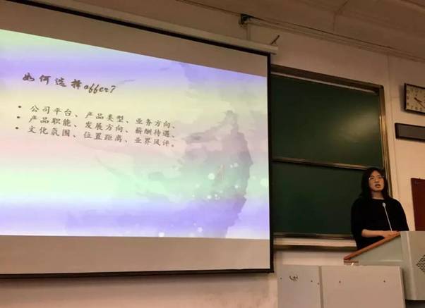马宇飞同学通过细致的分析,为学弟学妹们总结了职业选择中的九个要素:公司平台、产品类型、业务方向、产品职能、发展方向、薪酬待遇、文化氛围、位置距离、业界风评。选择之后便是确定目标。马宇飞同学详细介绍了秋招的流程,对学弟学妹们参加秋招提供了非常宝贵的建议。不以物喜,不以己悲,我们要坦然接受每一个状态的变化,在找工作的过程中,最重要的是充分准备、坚持不懈及平和心态。理想与现实的交锋,最终胜出的一定是自己。