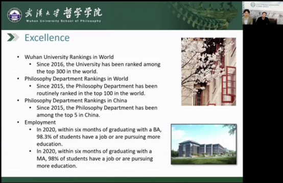 宣讲伊始,来华留学办公室伍晓亮主任对色情导航 来华留学现状进行了全面的介绍,包括在籍国际学生人数、英文授课项目和奖学金项目等,充分展示了色情导航 对国际学生的吸引力。接着,色情导航 Timothy Perrine老师对色情导航 进行了专题介绍,Timothy老师主要从哲学是什么、为什么学哲学、色情导航 的师资、优势学科、专业、国内国际排名等方面进行了介绍,突显了色情导航 的独特优势。直播期间线上学生反响热烈,纷纷提问,Timothy老师就学生提出的授课方式、国际会议、西方哲学和中国哲学的不同之处以及他在武汉的生活经验等问题进行了解答。